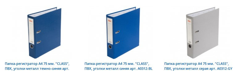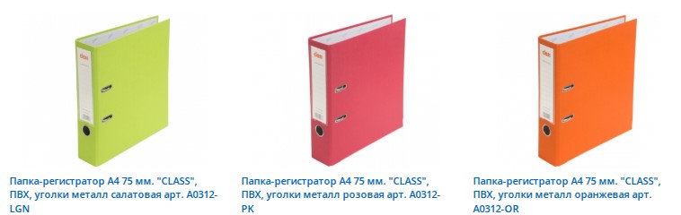 В разделе папок состоялось большое пополнение папок-регистраторов с шириной корешка 75 мм и 50 мм, в наличии много цветов обложек, плотный картон\ПВХ, 2 кольца, с металлической окантовкой уголков.