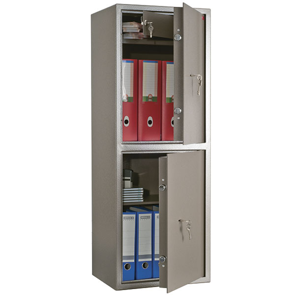 - сейф для хранения документов и ценностей, 2 отделения - 58 л. + 80 л. + 13 л. трейзер (кассовое отделение) с отдельным запорным механизмом;
