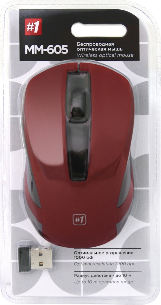 Беспроводная мышь Defender MM-605, обтекаемый эргономичный корпус красного цвета, радиус действия беспроводного передатчика 10 метров, срок службы аккумулятора 12 месяцев.