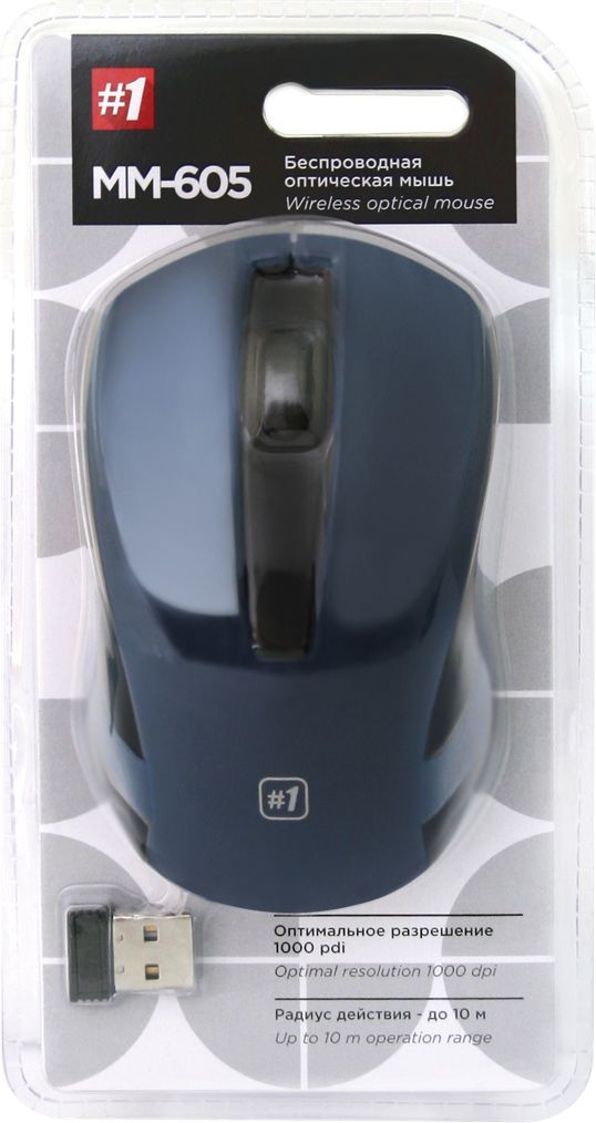 Беспроводная мышь Defender MM-605, обтекаемый эргономичный корпус синего цвета, радиус действия беспроводного передатчика 10 метров, срок службы аккумулятора 12 месяцев.