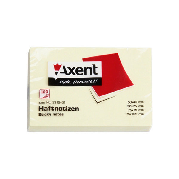 Блок бумажный с липким слоем Axent 2312-01, 100 листов в упаковке, прямоугольный. Размер 50х75 мм, желтый пастельный оттенок.