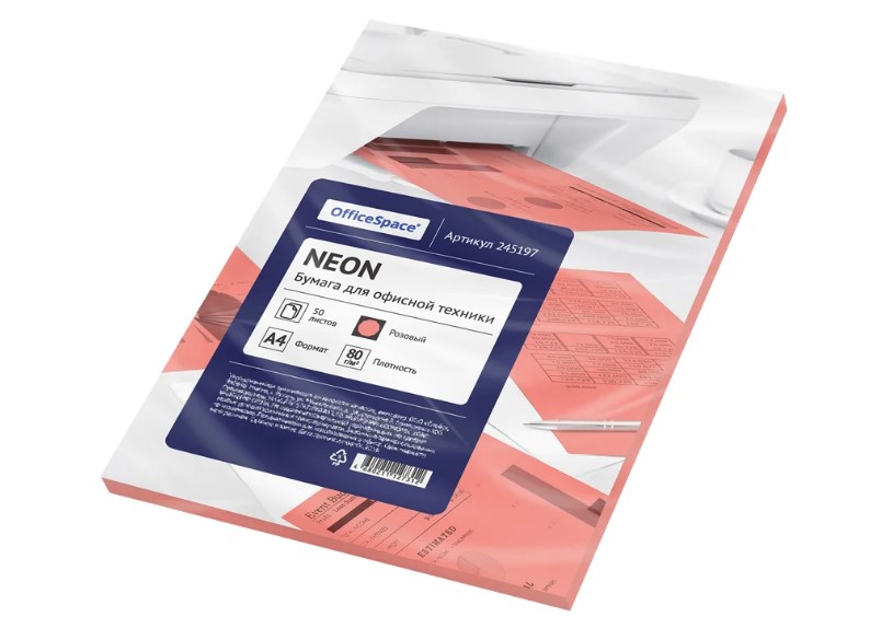Бумага цветная A4 80г/м 50л. OfficeSpace, неон розовый (245197)