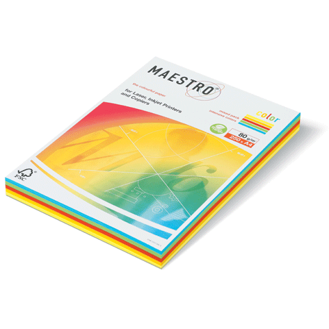Цветная офисная бумага Mastro Color Mix Intensive - яркие и насыщенные цвета: солнечно-желтый - 50 листов, кораллово-красный - 50 листов, ярко-зеленый - 50 листов, светло-синий - 50 листов, канареечно-желтый - 50 листов. Плотность листов 80 г/м2. Бумага имеет европейский экологический сертификат EU Ecolabel AT/11/001.