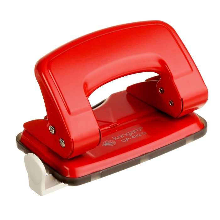 Дырокол Kangaro, прочный металлический корпуса красного цвета; с пластиковым форматером; пробивает стопу бумаги до 16 листов.