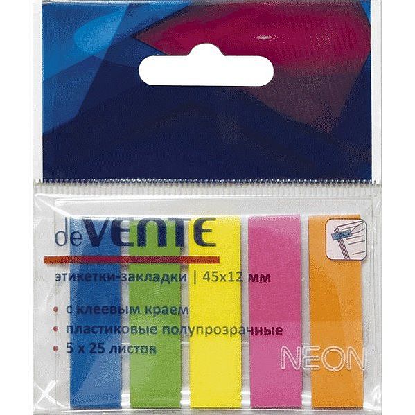 Набор самоклеящихся этикеток-закладок deVENTE, 45x12 мм, 5 цветов неон по 25 листов, в прозрачной пластиковой упаковке.