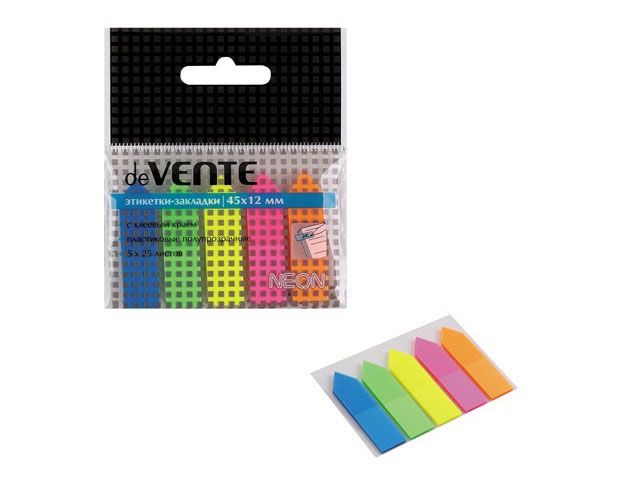 Набор самоклеящихся этикеток-закладок deVENTE в форме стрелок, 45x12 мм, 5 цветов неон по 25 листов, в прозрачной пластиковой упаковке.