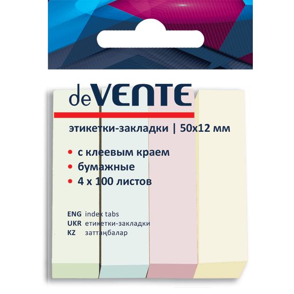 Закладки-флажки с клеевым краем прямоугольные, 4 пастельных цвета по 100 штук - желтый, зеленый, розовый, бирюзовый, размер листа 12х50 мм.