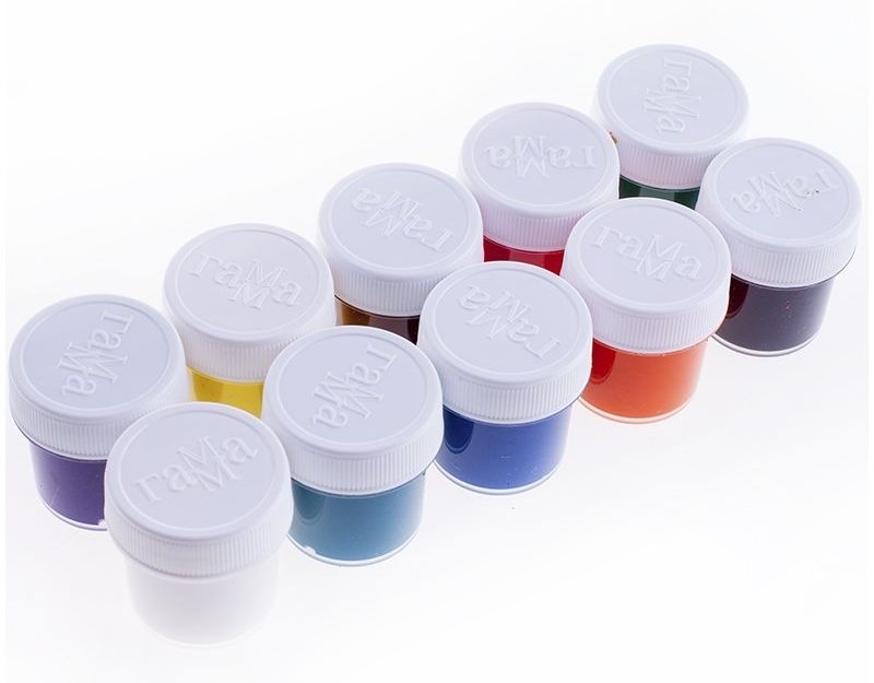 - баночки с цветами: алая, белая, бирюзовая, зеленая, коричневая, лимонная, оранжевая, синяя тёмная, фиолетовая, чёрная;