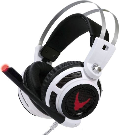 - геймерские наушники-гарнитура с функцией виброотклика, белый цвет корпуса, подходит для использования с игровыми консолями;