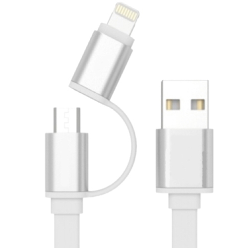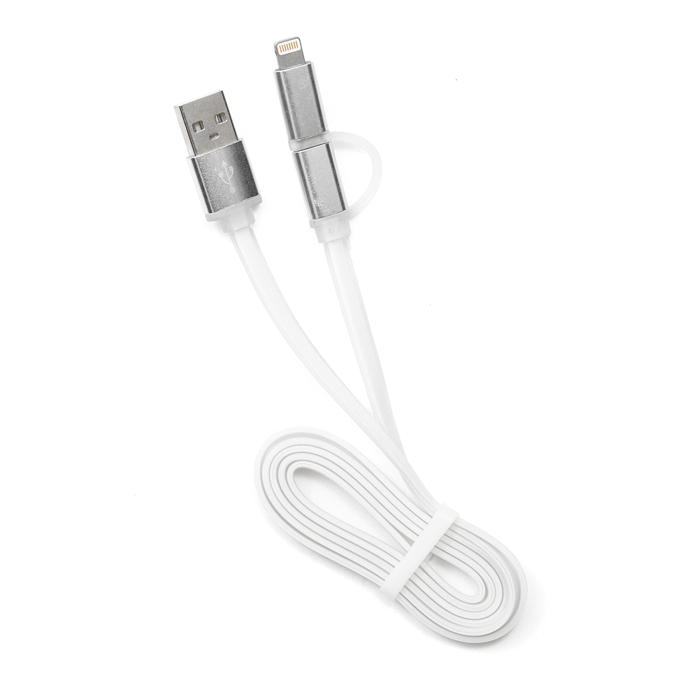 Кабель для подключения смартфонов, iPhone, мобильной техники; один разъём USB 2.0, один microBM + дополнительно разъём Apple Lightning; длина кабеля 1 метр, плоский.