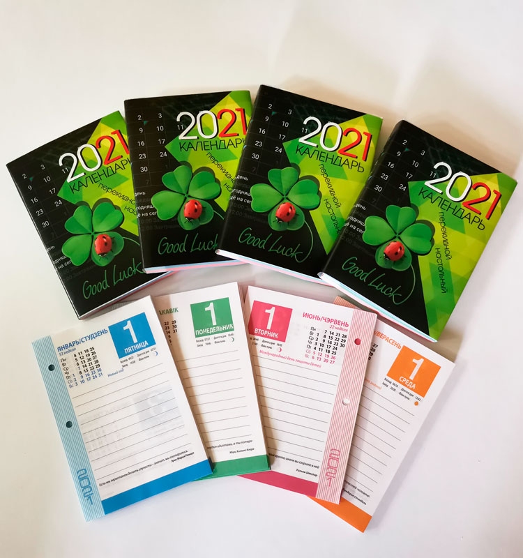 - календарь перекидной настольный на 2021 год, бумага офсет, содержит знаменательные даты, профессиональные праздники, афоризмы и пословицы, каждый квартал выделен отдельным цветом;
