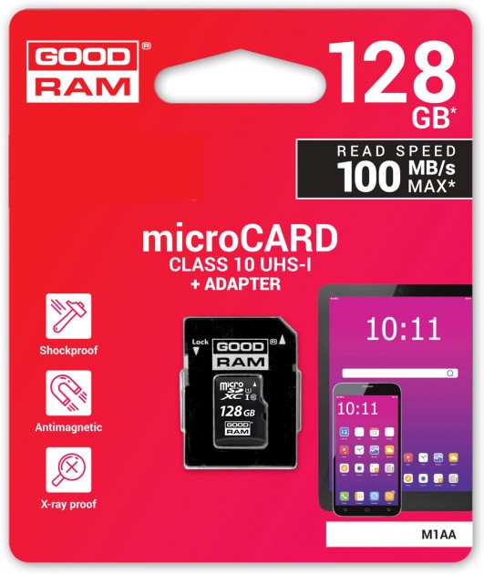 - карта памяти 128 Гб для мобильных устройств/цифровых камер/планшетов/смартфонов и прочей техники, чтение/запись 100/10 Мб/с, адаптер-переходник SD в комплекте;