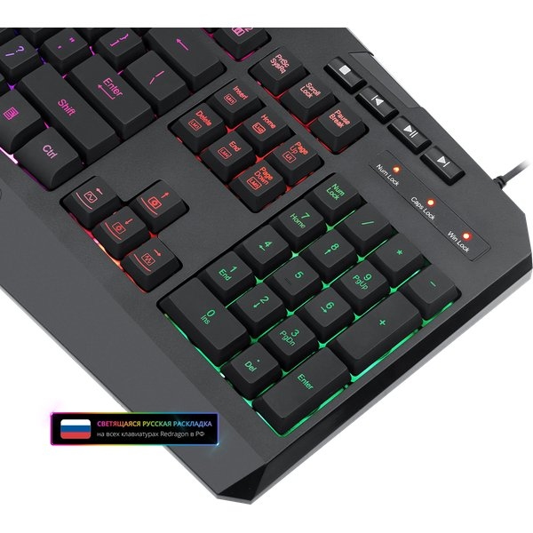- расширенная RGB-подсветка с регулировкой яркости (символы на клавишах также имеют подсветку), функция Anti-Ghost для предотвращения фантомных нажатий, обмен функциями между стрелками и блоком WASD, аппаратная блокировка клавиши WIN;
