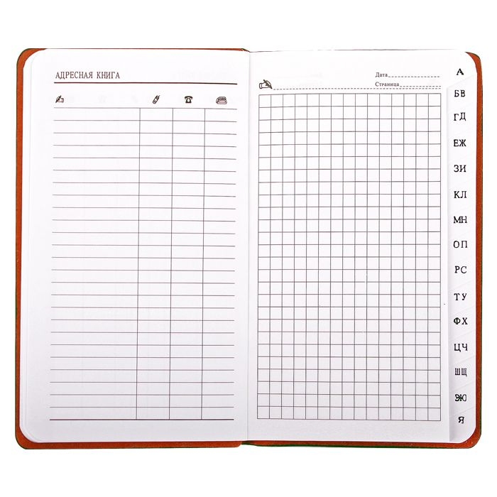 - есть алфавит, телефонные коды стран мира, адресная книга, раздел для записей;