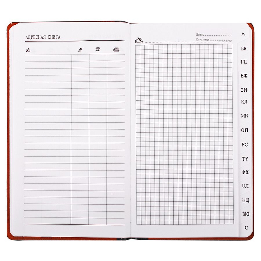- книга алфавитная, твердый переплет, в клетку;
