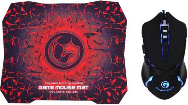 Игровой комплект мышь и коврик, Marve M309+G1. Черно-красный современный геймерский дизайн коврика и мышки. Мышь с подсветкой.