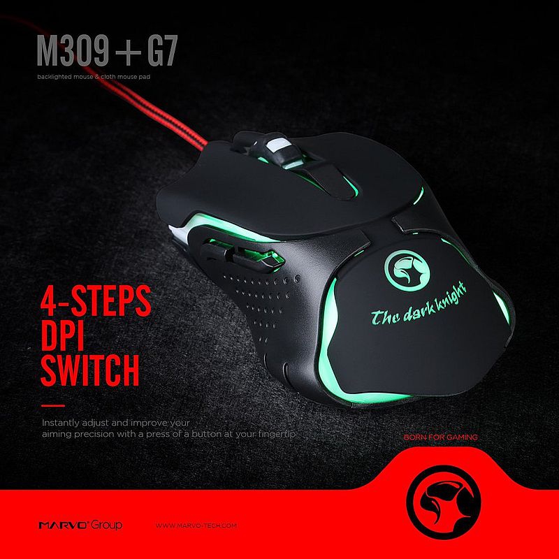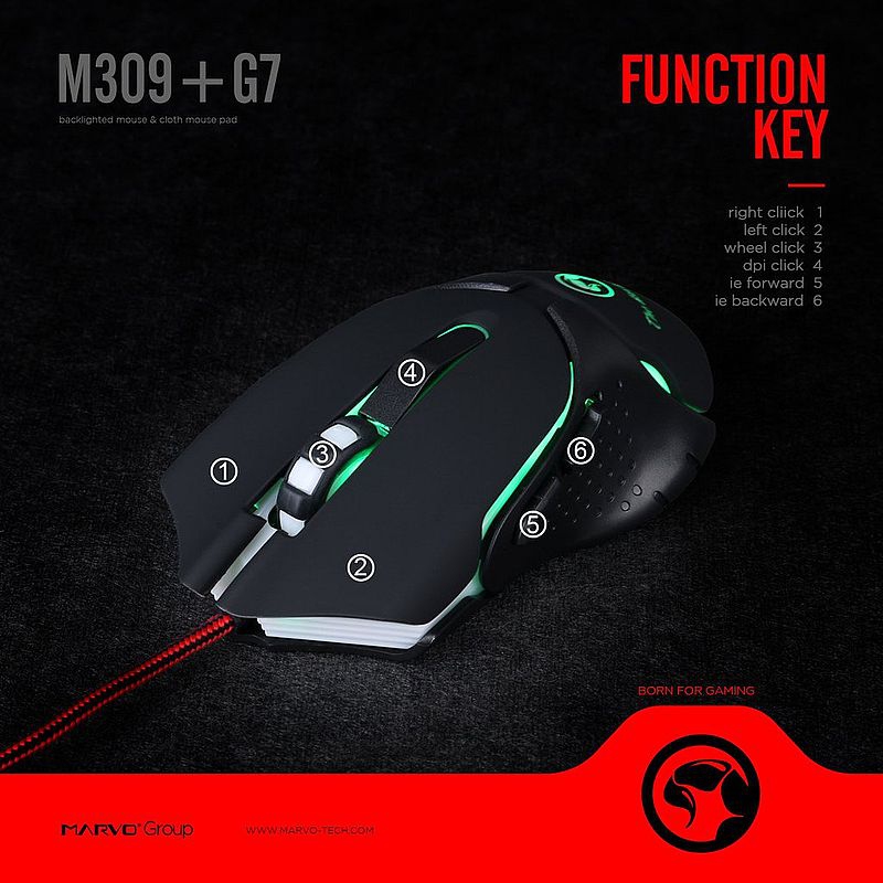 Игровой комплект для заядлых геймеров: игровая мышь Marvo M309 с оптическим сенсором и оригинальный коврик G7. Мышь проводная, 6 кнопок (3 программируемых), есть подсветка мыши 7 цветов. Длина кабеля мышки 1.5 метра. Тканевый коврик оригинального дизайна.