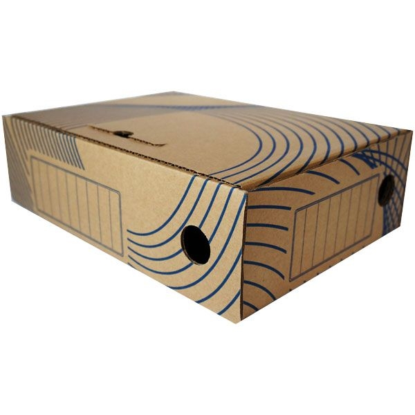 - короб архивный для документов формата A4, изготовлен из плотного гофрированного картона бурого цвета с синим принтом;