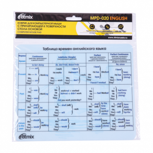 Коврик для мыши, с рисунком "таблица времен английского языка", материал - ПВХ, полипропилен, клейкая основа, размеры коврика 220 x 180 мм.