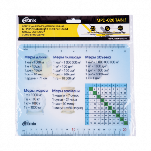 Коврик для мыши, с рисунком "таблица мер, весов, длины", материал - ПВХ, полипропилен, клейкая основа, размеры коврика 220 x 180 мм, на нижней кромке нанесена измерительная линейка до 20 см.