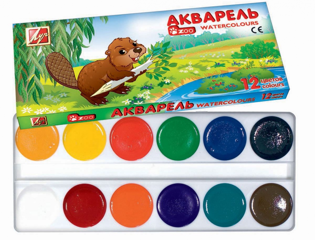 - краски акварельные медовые полусухие, в футлярчике, 12 цветов;