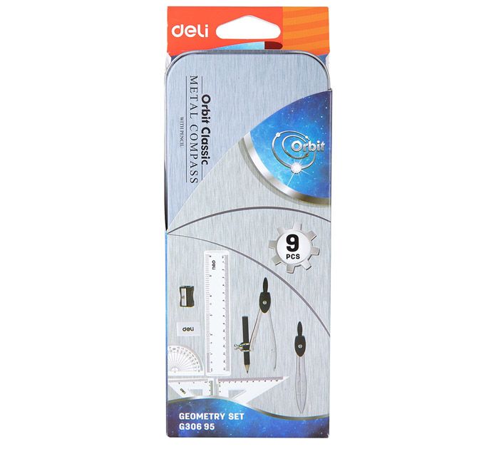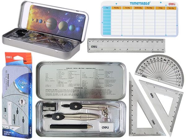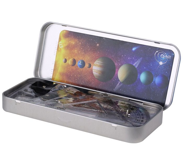 - набор чертежный, металлический метал с цветным принтом, набор включат в себя 9 предметов: циркуль чертежный, карандаш чернографитовый твердо-мягкий (HB), циркуль измерительный (до 280 мм), ластик, точилка, 2 треугольника, транспортир, линейка, расписание занятий;