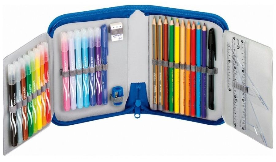 - пенал с наполнением, его по достоинству оценят школьники любого возраста: 8 цветных карандашей Color'Peps, 14 фломастеров Color'Peps Long Life, набор ученических линеек, прочная и удобная точилка Maped на 1 отверстие, 2 простых карандаша твердо-мягких, 2 шариковых ручки;
