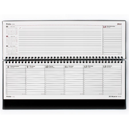 Планинг "Офис", на 2018 год, в линейку, материал обложки - мирадор (бумвинил матовый на бумажной основе). Разворот - одна неделя, на спирали, русский и английский языки, с календарем и телефонной книгой.