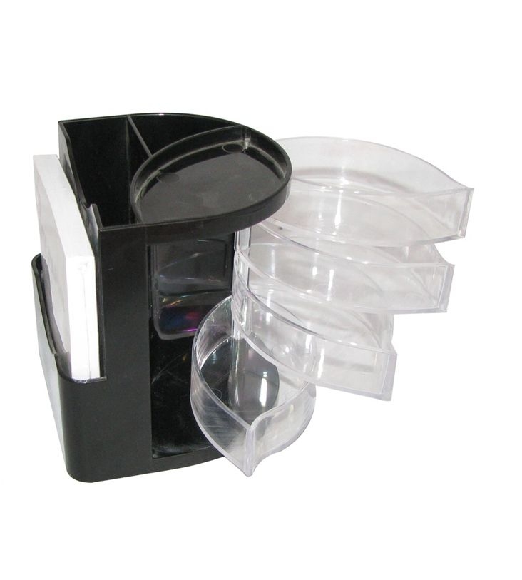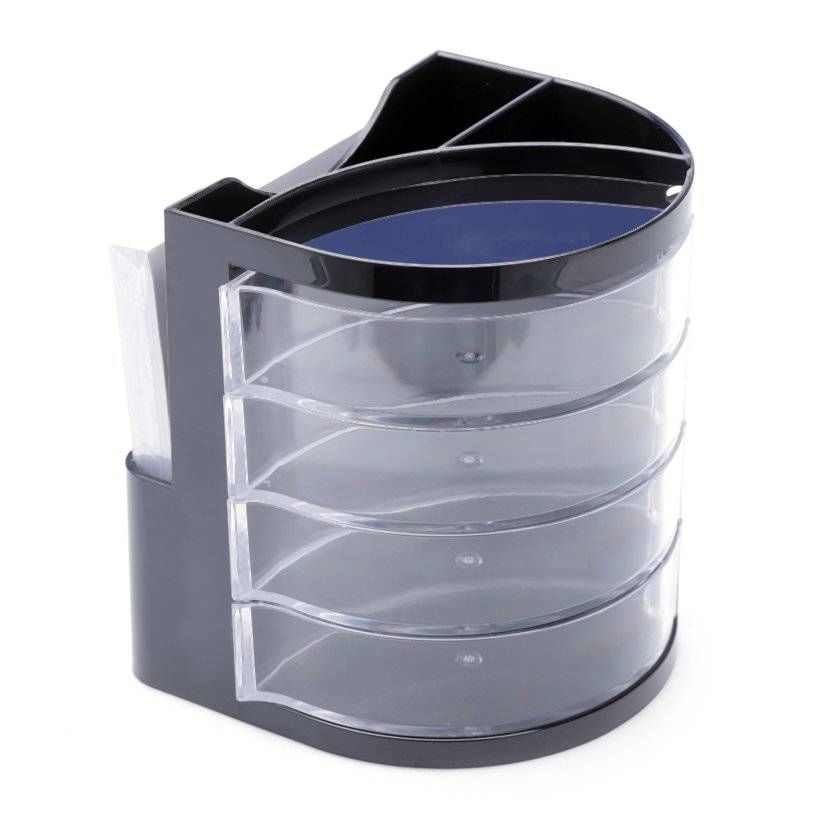 - 4 выдвижных отделения из прозрачного пластика, 1 верхнее отделение для мелочей, 1 задний кармашек для бумаги для заметок;