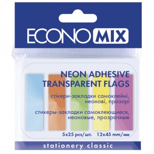 Закладки-стикеры, прямоугольные, с клеевым краем, размер 12х45 мм, 5 цветов по 25 штук, яркие неоновые цвета.