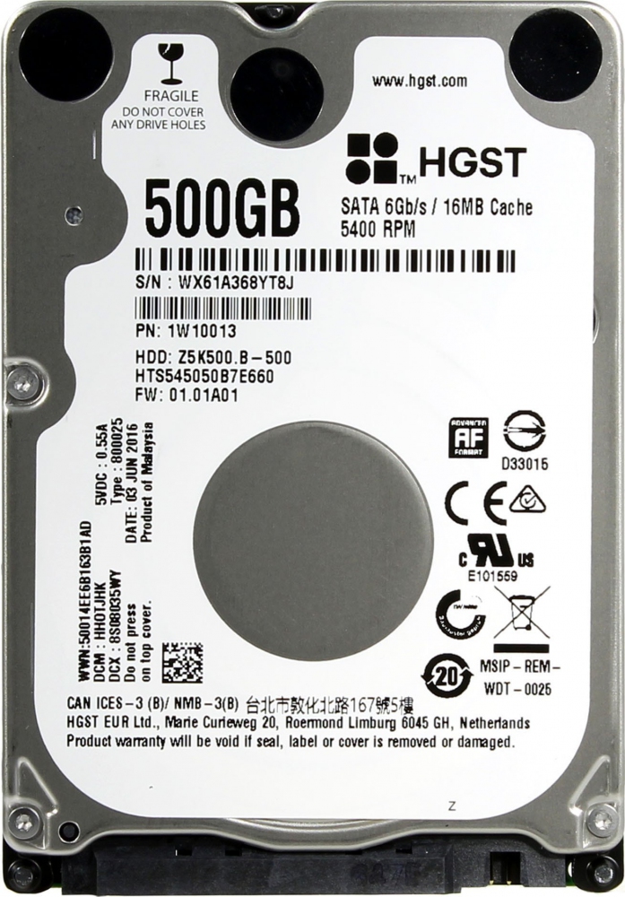 Жесткий диск для ноутбука форм-фактор 2.5", объем 500 гигабайт, интерфейс SATA 6 GB/s, объем буфера 8 Мб.